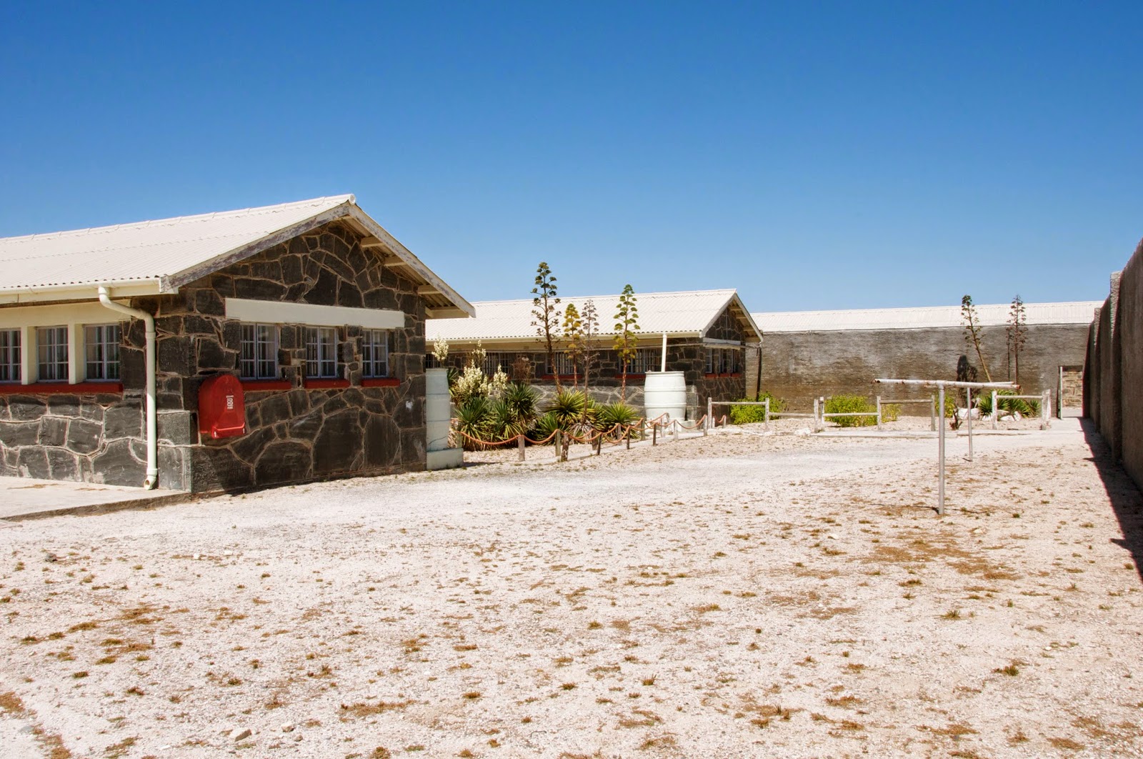 Mandela's cell was the fourth window from the corner, as seen here in the courtyard where he used to play tennis, apparently very well.