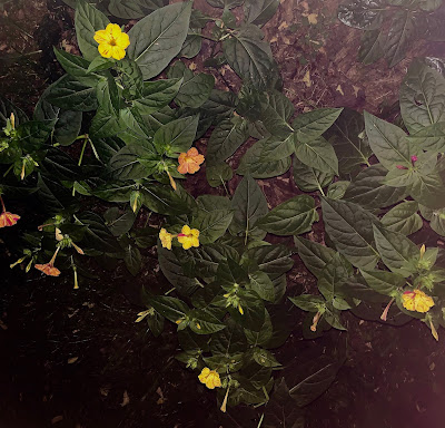 I know this is not a critter, but it is another thing that is cool during our walk back to my flat in the evening, as it only blooms in the evening, finishing by morning - hence the name 4 O'clock Flower, (Mirabilis Jalapa). It has a very pretty blossom which is loaded with fragrance, almost lemony/sweet. ⬐ Daytime Nighttime ⬎